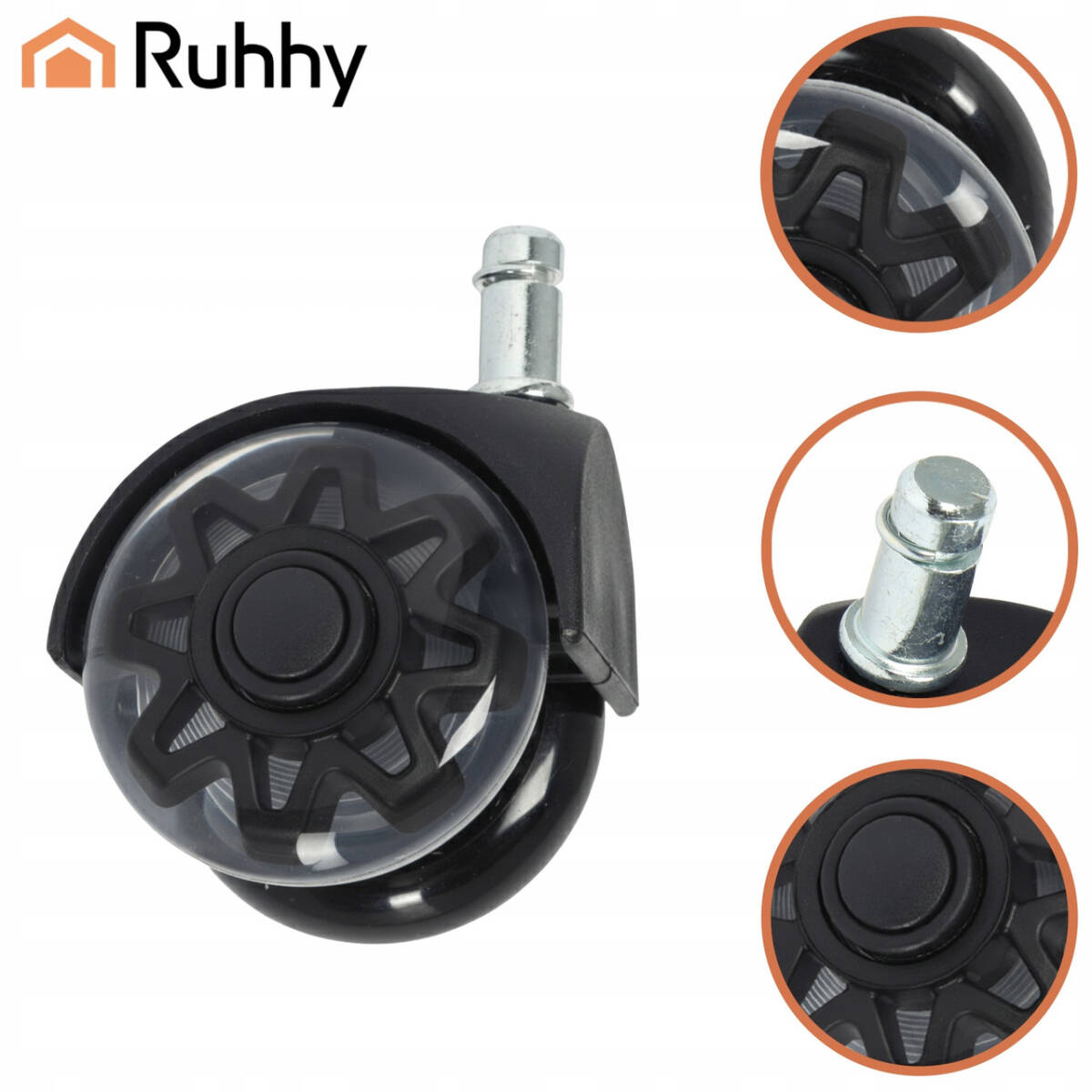 Коліщата RUHHY 2,5" забезпечують тиху роботу (менше 25 дБ), плавний рух і повний захист підлоги без килимків. М’який поліуретановий шар не дряпає покриття, а посилена конструкція з підшипником зі сталі високовуглецевої марки слугує роками. Монтаж без інструментів: вийміть старі — вставте нові.