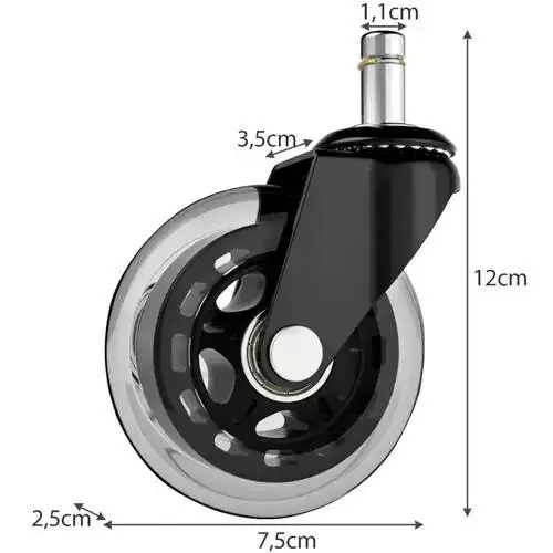 УНІВЕРСАЛЬНІСТЬ - у комплект входять 5 роликів, які дають змогу замінити всю п'ятизіркову базу на стілець: офісний, геймерський, обертовий або дитячий. Комплект підходить для більшості стільців, доступних на ринку, зі штоком fi 11 мм.