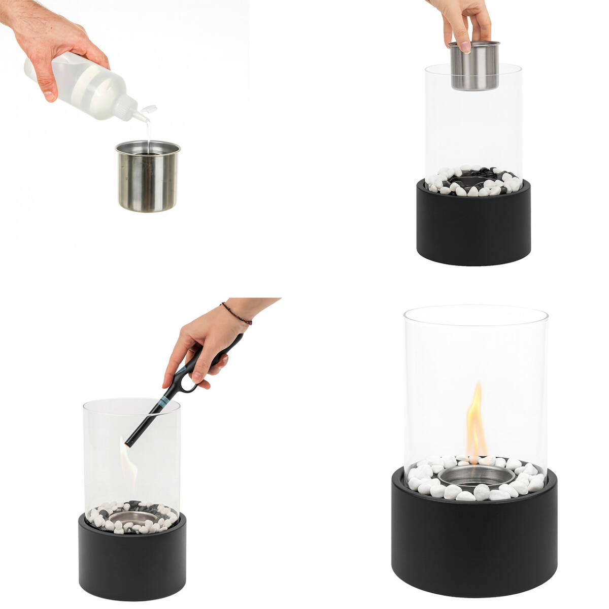 - Чисте горіння: біоетанол згорає без диму та запаху — без димоходу і попелу.