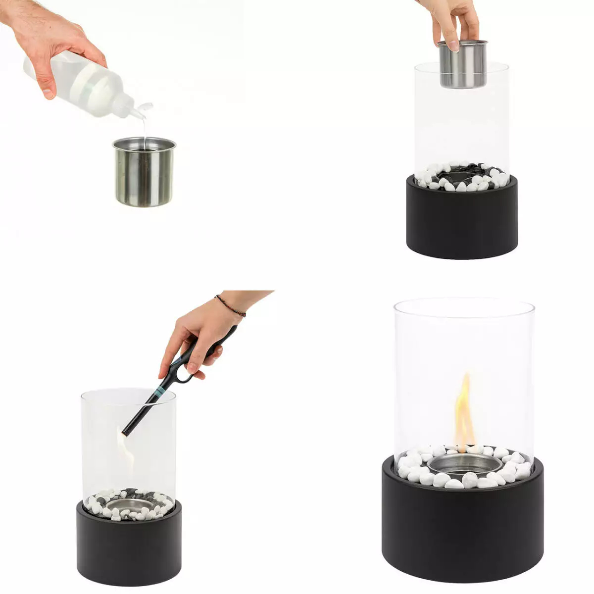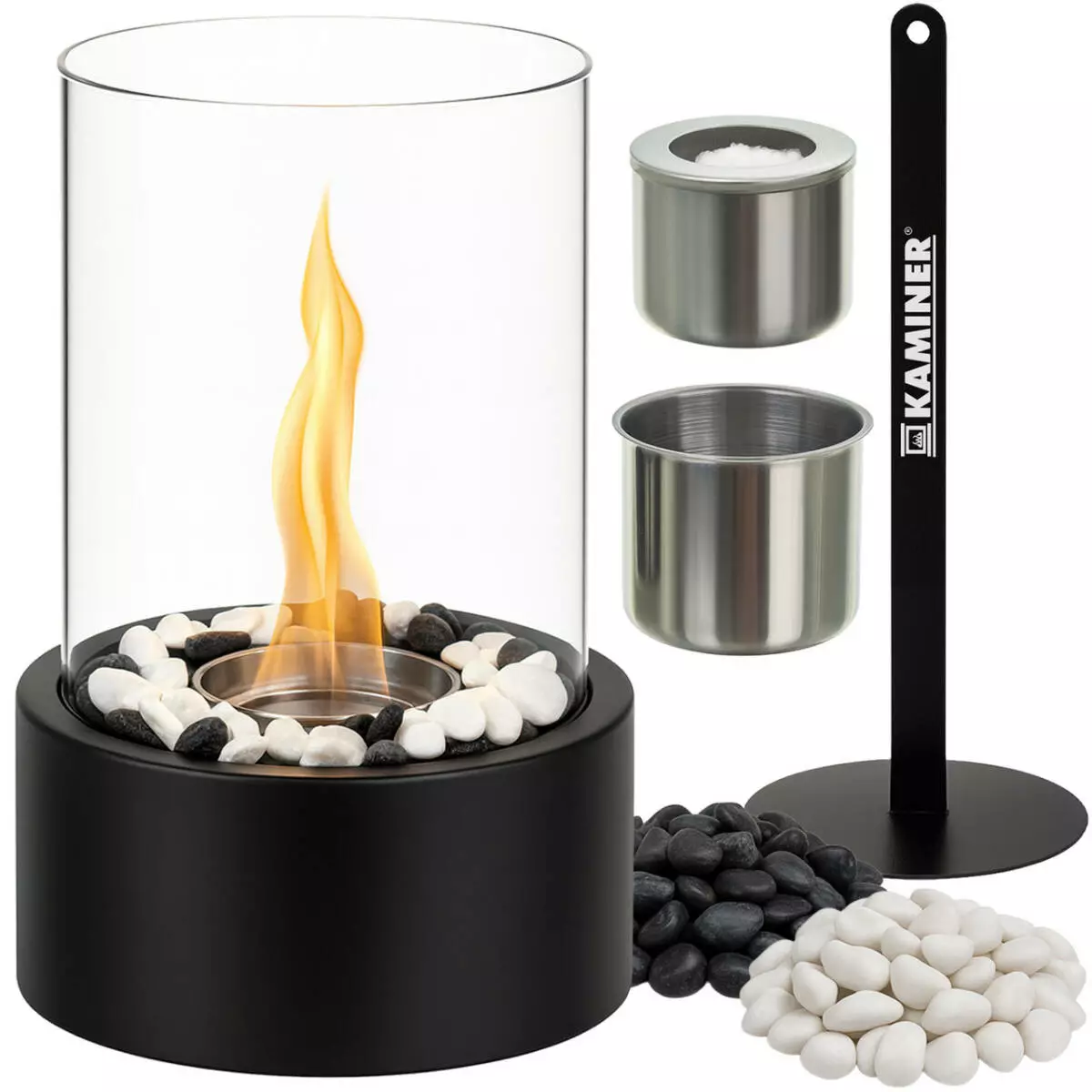 Вільностоячий біокамін KAMINER працює на біоетанолі: чисте горіння без диму, сажі та запаху. Прозора скляна копула підкреслює красу вогню, захищає полум’я від випадкового дотику та створює ефектну гру світла. У комплекті декоративні камінці та вигасник — усе, що потрібно для одразу готового користування.