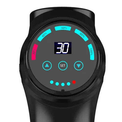 ДО 30 СТУПЕНІВ ІНТЕНСИВНОСТІ - масажер має до 30 ступенів інтенсивності масажу! Це дуже великий діапазон, що дозволяє індивідуально регулювати швидкість залежно від м'язів, у яких вона використовуватиметься. Пістолет має чіткий дисплей, на якому відображається заданий рівень, тому маєте постійний контроль над ним. Інтенсивність роботи змінюється за допомогою чутливої сенсорної панелі, досить злегка доторкнутися до неї – зміни режиму не доведеться змушувати її.