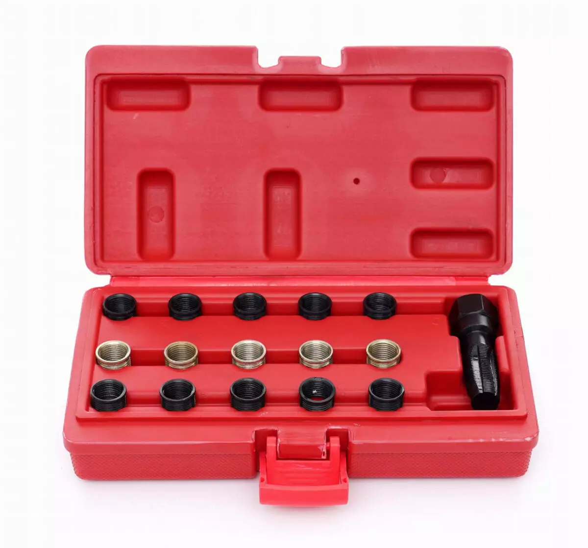 - Широкий набір: містить різьбонарізувач і 15 вставок для різьби.