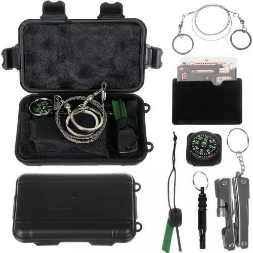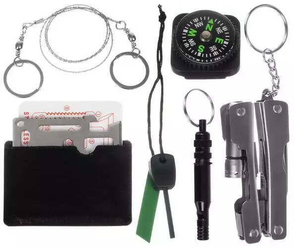 7 в 1: Набір включає карту виживання 11 в 1, компас, мультитул, мотузкову пилку довжиною 70 см, розпалювач зі стрижнем, герметичний контейнер зі свистком та наклейку з попередженням.