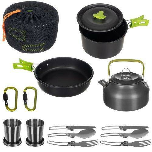 - Багато предметів включені - набір кухонного начиння включає безліч елементів, у тому числі каструлю, чайник, сковороду, 2x ніж, вилку, складану ложку, 2x карабін, 2x складану чашку, сумку для зберігання. До набору також входять мішечки для столових приладів.