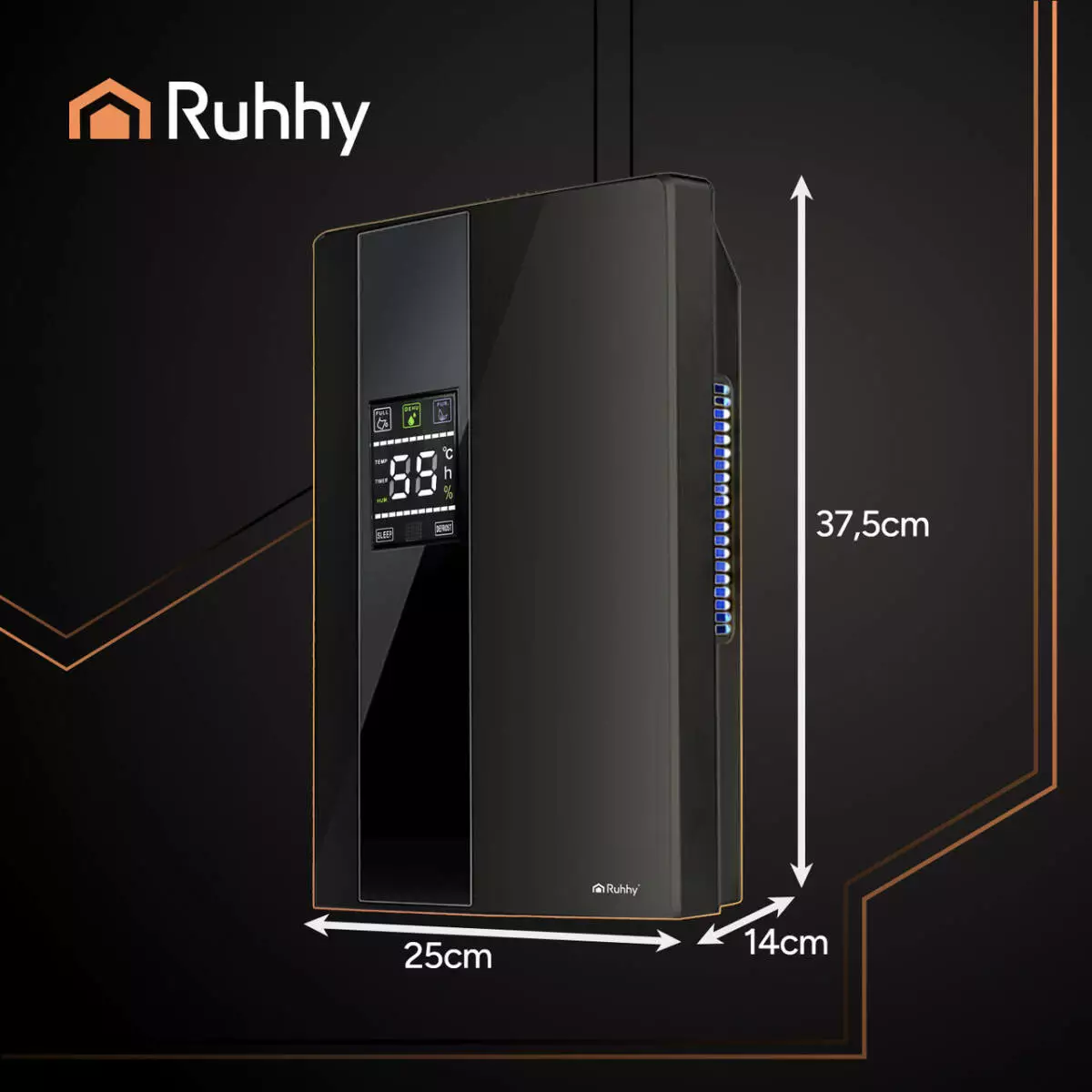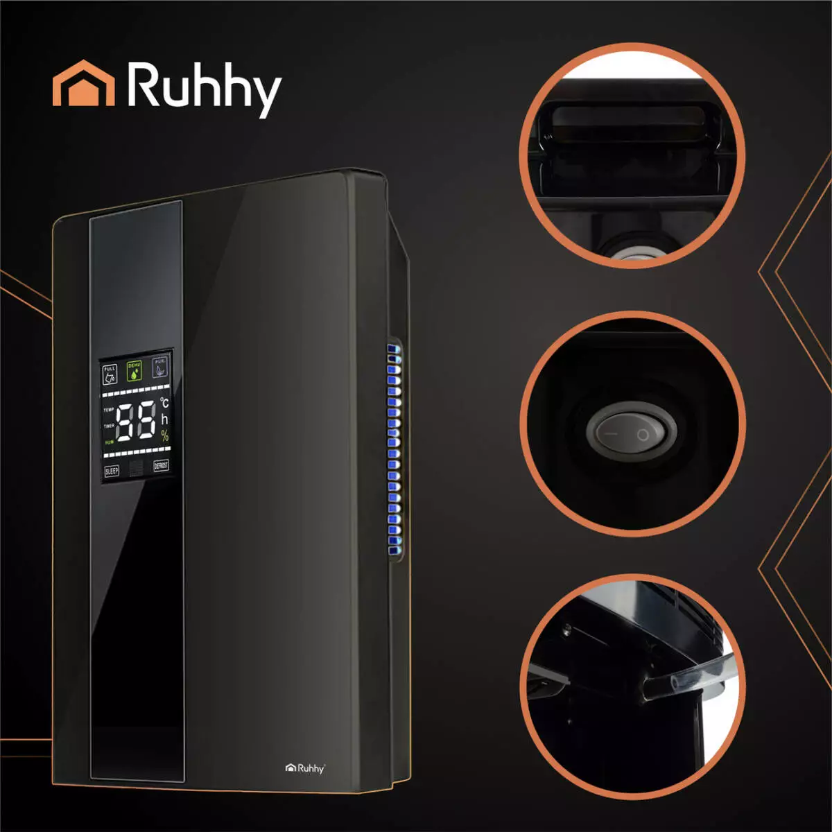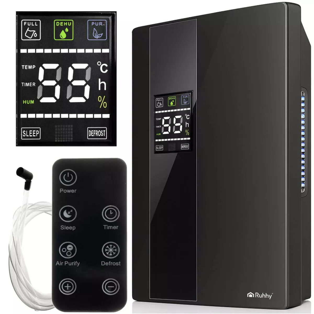 RUHHY 2в1 поєднує функції осушення та очищення повітря: прибирає надлишкову вологу, усуває задуху, зменшує ризик появи плісняви й неприємних запахів. Інтелектуальне підтримання вологості, режим Defrost, тихий хід 25–30 дБ і дистанційне керування роблять пристрій ідеальним для ванної, кухні, спальні, пральні чи підвалу (до 30 м²).