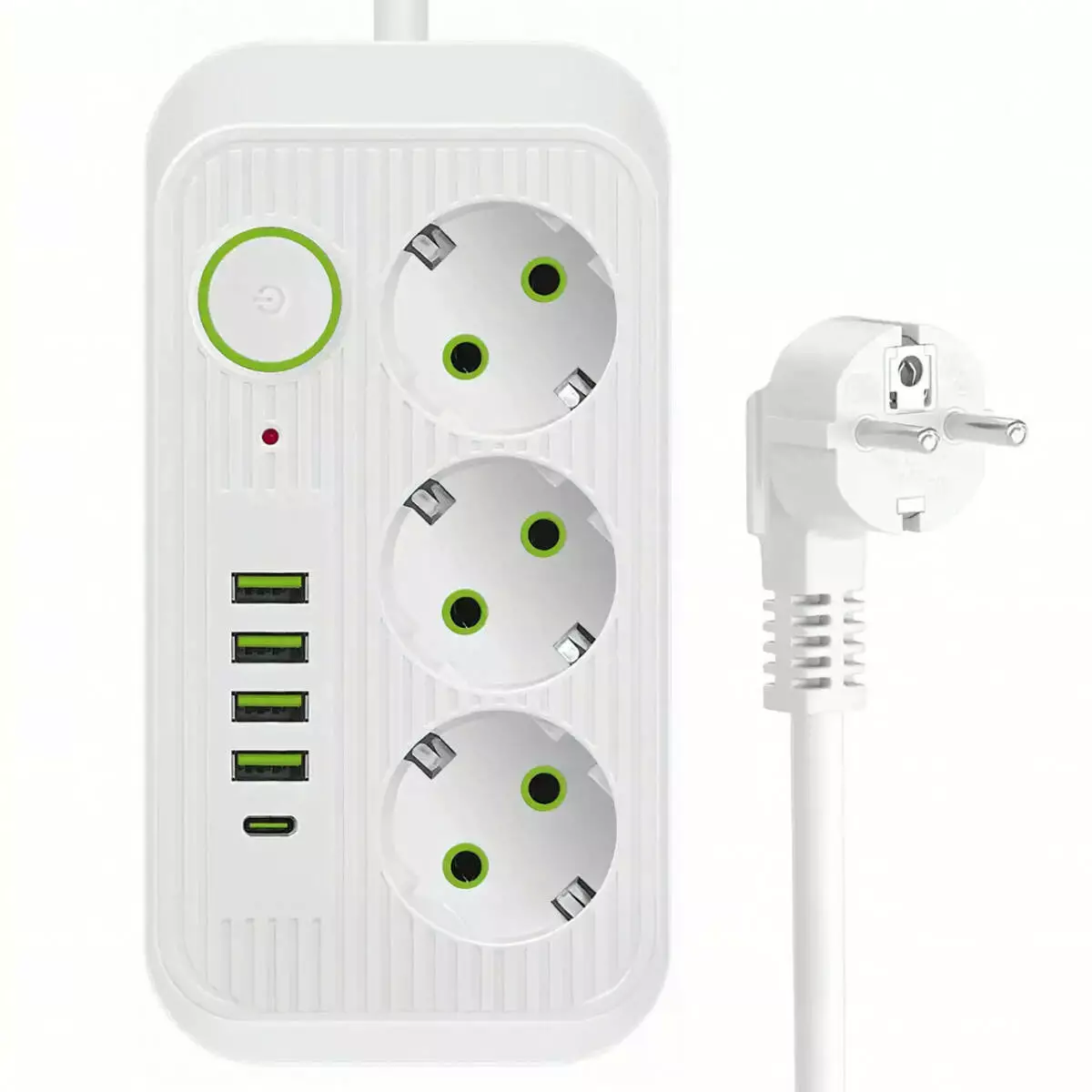 Подовжувач мережевий з USB 2м (3 розетки, 5 USB, вкл. USB-C), білий, з вимикачем
