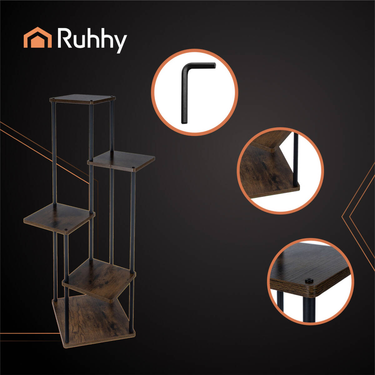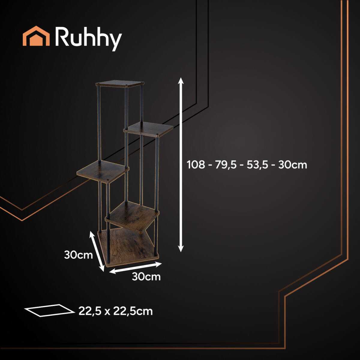Стійка для квітів RUHHY – це ідеальне рішення для розміщення кімнатних рослин у сучасному інтер’єрі. Конструкція з 5 рівнів дозволяє розмістити декілька вазонів на мінімальній площі. Міцний металевий каркас витримує до 75 кг загального навантаження, а полички з МДФ мають вигляд натурального дерева.