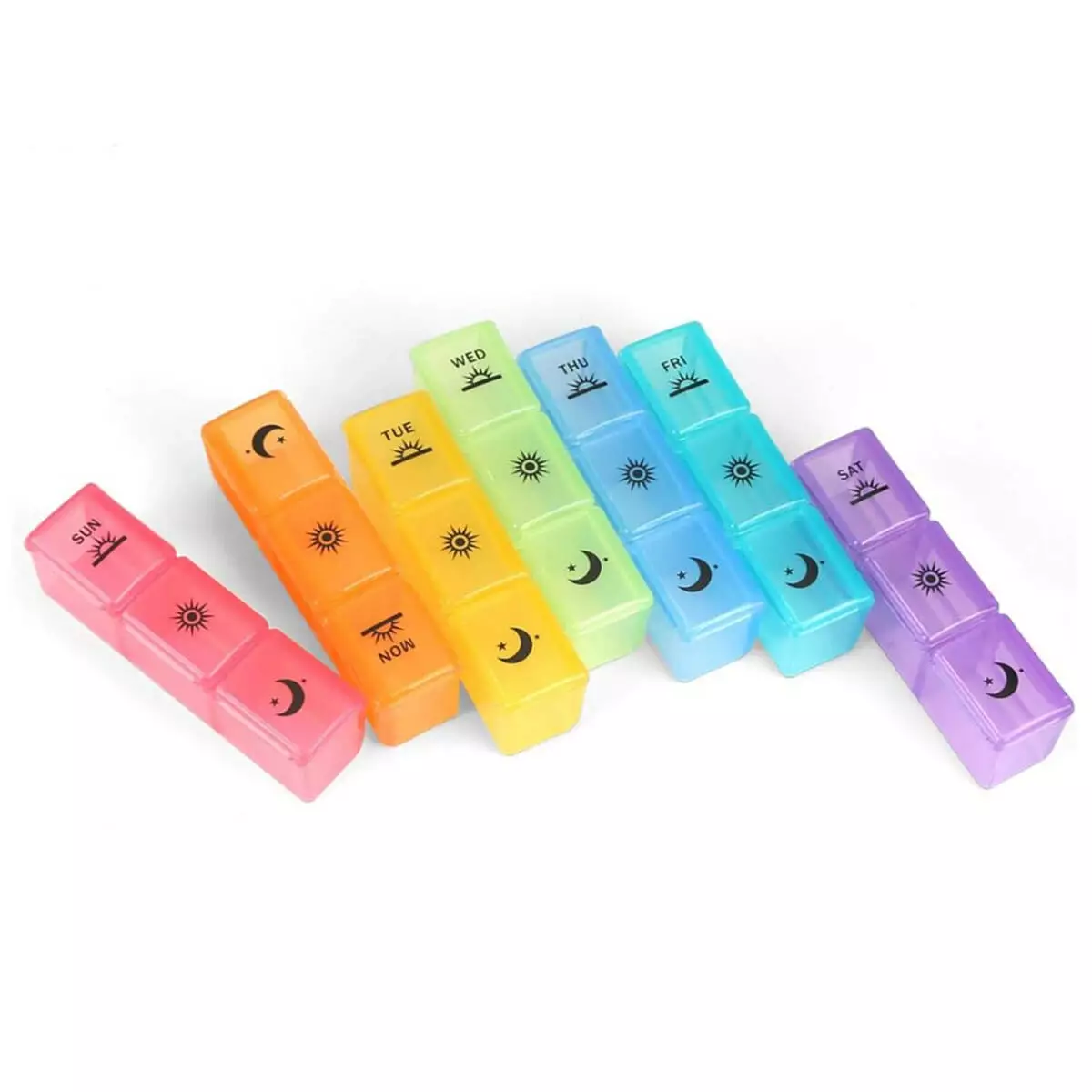 Практичний контейнер для таблеток допоможе організувати прийом ліків на цілий тиждень із поділом на три частини дня. Завдяки продуманій конструкції кожен день тижня розташований у висувному відсіку, що дозволяє легко контролювати, коли потрібно прийняти ліки.