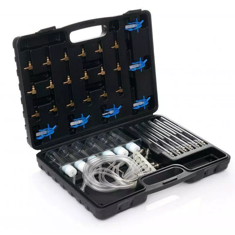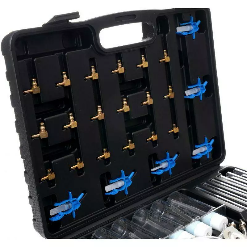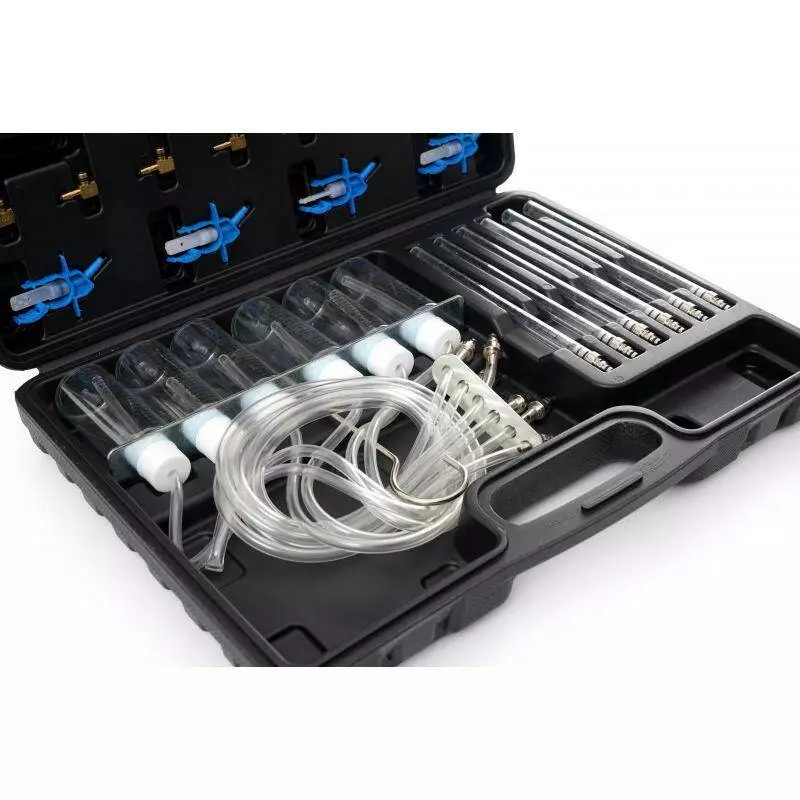 - Набір насадок дозволяє вимірювати системи упорскування Bosch, Siemens, Denso, Delphi у двигунах до шести циліндрів.