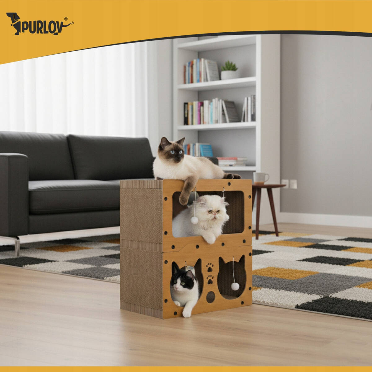 Двоповерховий драпак-будиночок Purlov — це комфорт і активність для кота та спокій для ваших меблів. Жорсткий HDF-каркас забезпечує стабільність, а натуральна гофрована поверхня спрямовує інстинкт дряпання на драпак. У комплекті — 4 м’ячики для щоденних ігор.