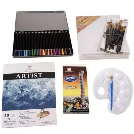 олівців, скріпки, блок, палітра для змішування фарб і 3 полотна для