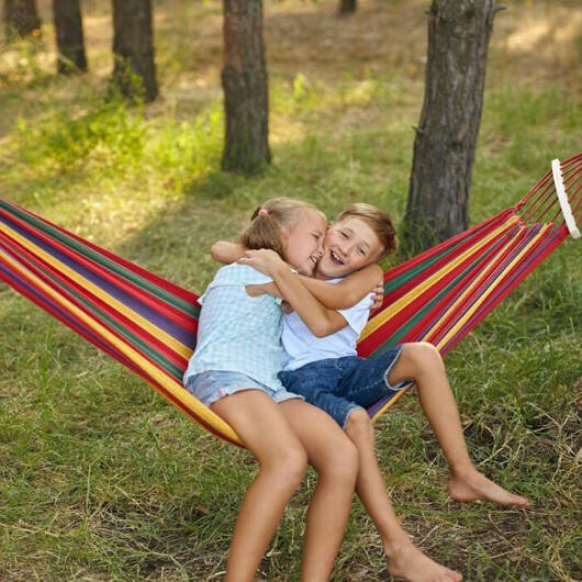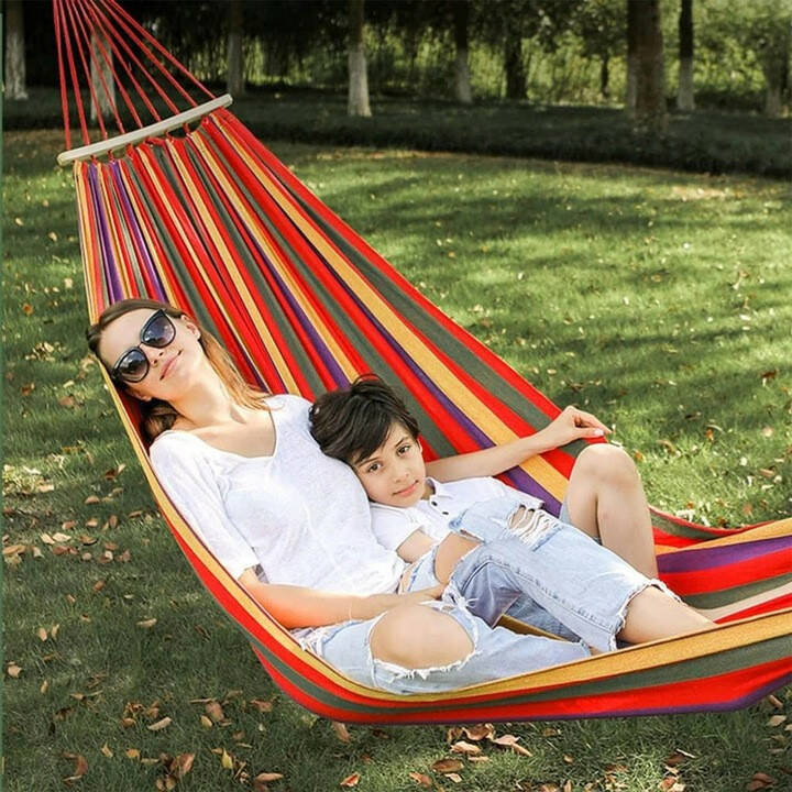- Міцна конструкція - Гамак виготовлений з міцної та щільної бавовни, що гарантує його довговічність та міцність. Дерев'яні стабілізуючі поперечини підвищують комфорт використання, забезпечуючи приємні відчуття під час лежання.