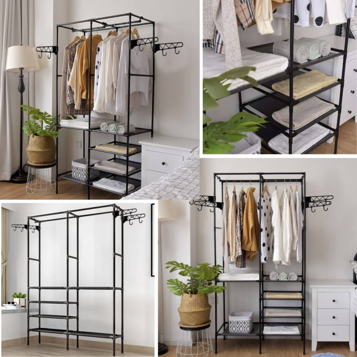 - ТЕХНІЧНІ ХАРАКТЕРИСТИКИ - колір: чорний; матеріал: пластик + метал; кількість полиць: 6; кількість підвісних штанг: 2; кількість бічних вішалок 8; максимальне навантаження: вішалки: 20 кг, полиці: 40 кг; розміри: 173 х 36 х 108 см; вага: 4,5 кг; вага в упаковування: 4,9 кг.