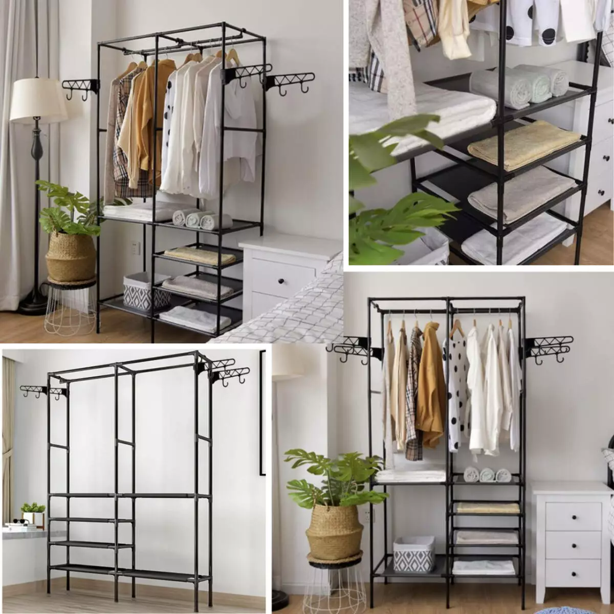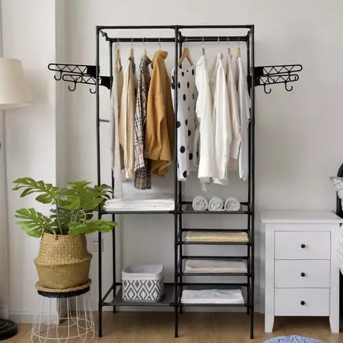 - ЕКОНОМІЯ ПРОСТОРУ - вішалка є ідеальним рішенням для тих, хто має обмежений простір або тимчасовий предмет меблів вдома. Вішалка легка і адаптується до різних приміщень. Має 6 полиць, 2 підвісні штанги та 8 вішалок.