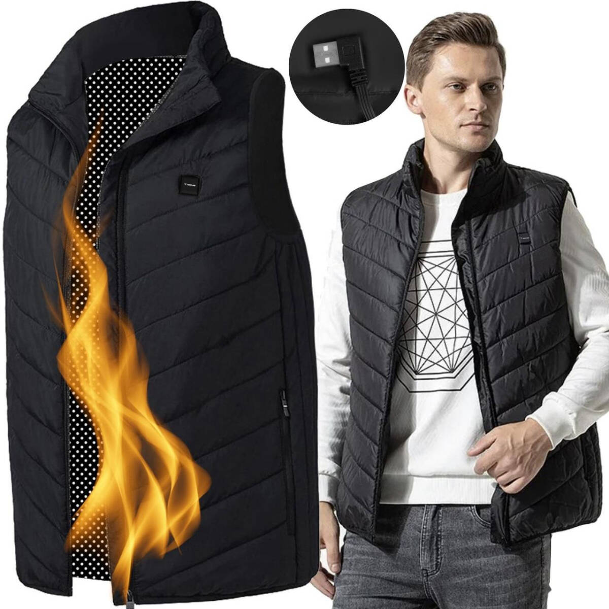 Зовнішній вигляд: Жилет має модний стьобаний дизайн у спортивному стилі, що адаптується до тіла, забезпечуючи зручність і ефективну ізоляцію від холоду. Жилет застібається на блискавку, має внутрішню кишеню з вбудованим USB-кабелем для підключення павербанка.