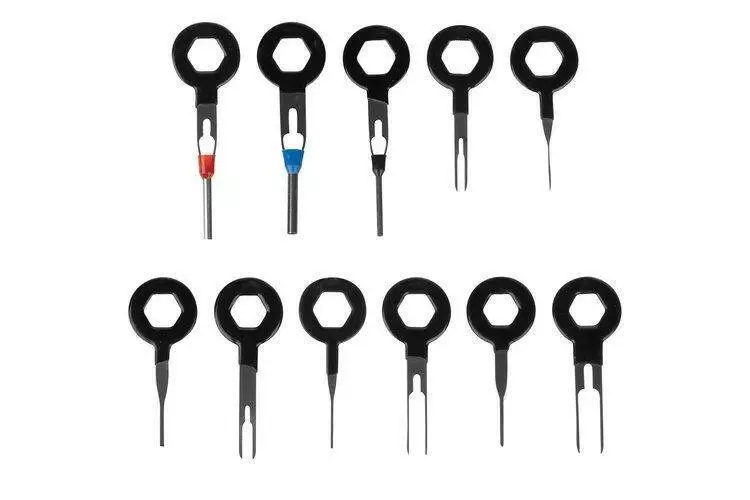 - БАГАТО ЕЛЕМЕНТІВ У КОМПЛЕКТІ - набір знімачів для оббивки включає багато елементів - крім 12 знімачів для оббивки, є також кліпси, 2 затискачі для кліпс (22,5 і 31 см), а також 8 радіоекстракторів, 11 ключів для шпильок, чохол на блискавку. і 4 гачки для зняття пломб.